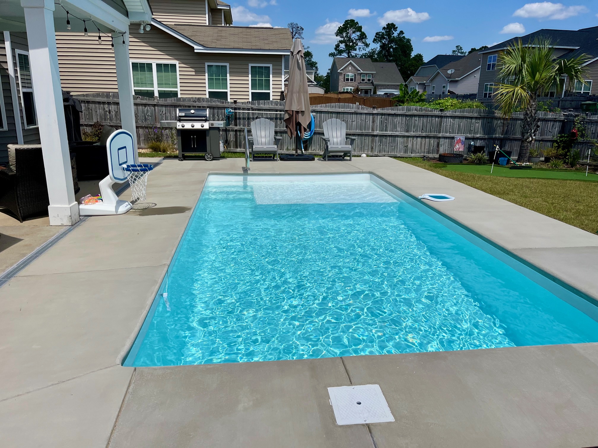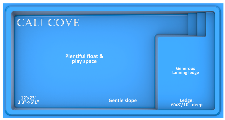The Cali Cove fiberglass pool by Rainforest Pools is a mid-sized inground pool designed to blend modern aesthetics with functional features, making it an excellent choice for homeowners seeking a stylish and versatile backyard retreat. Here are some key Features & Benefits: