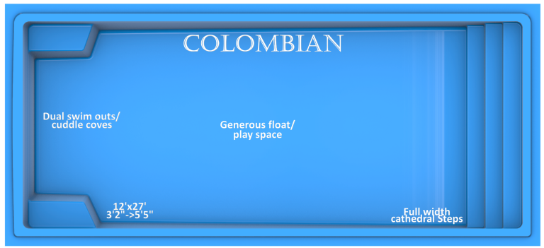 The Colombian fiberglass pool by Rainforest Pools is a medium-sized inground pool that combines modern design with practical features, making it an excellent choice for homeowners seeking both style and functionality in their backyard oasis.