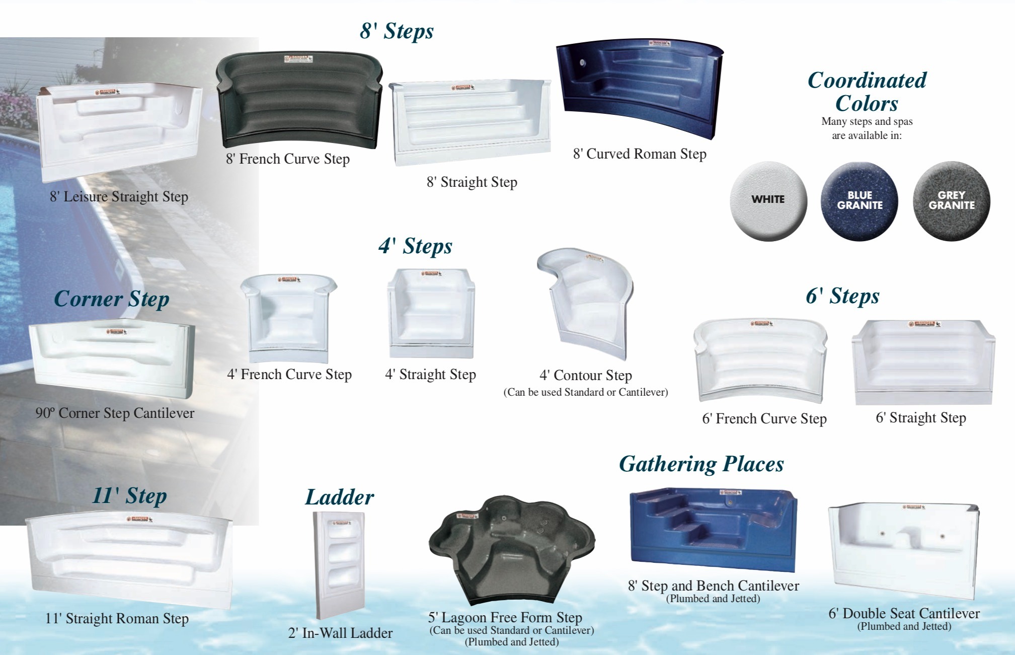 Drop-in steps are available in a wide range of styles, colors, and sizes. A popular example is the Wedding Cake style pool steps, which takes its nickname from its layered or tiered appearance. Drop-in stairs can be added to existing pools to enhance the look and functionality.